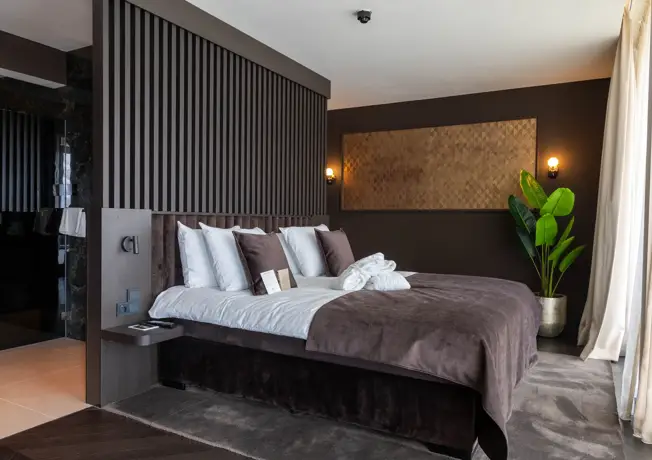 Entre dans une suite de luxe avec sauna privé et double douche à effet pluie. La Suite Marron est parfaite pour les invités qui veulent se détendre dans un environnement chaleureux et élégant. Tu profites d'un confort supplémentaire et d'un lit king-size pour une nuit de sommeil des plus agréables.