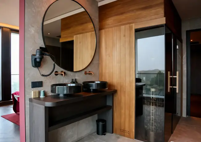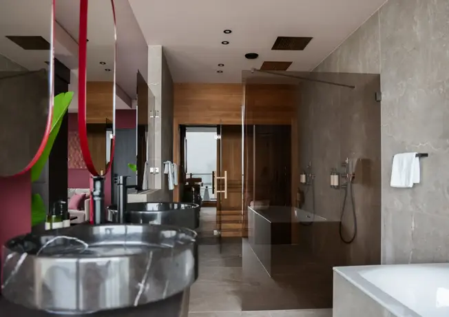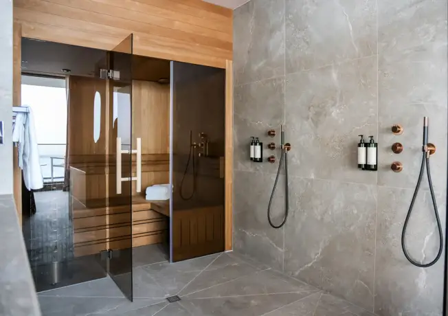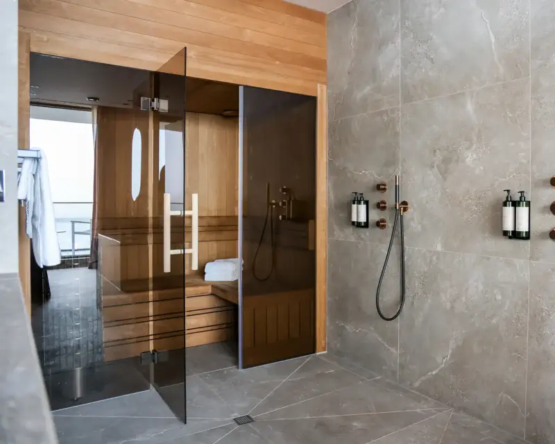 Selon la suite, tu profites d'un sauna privé, d'une double douche à effet pluie, d'une douche à l'italienne, d'une baignoire ou d'un bain à remous. Chaque suite dispose de ses propres installations de luxe.